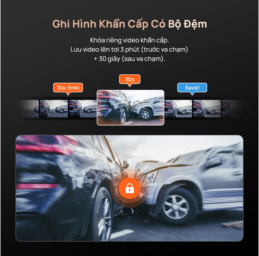 Ghi hình toàn diện: Lưu lại tối đa 3 phút trước sự kiện, toàn bộ diễn biến trong sự kiện và 30 giây sau khi va chạm.