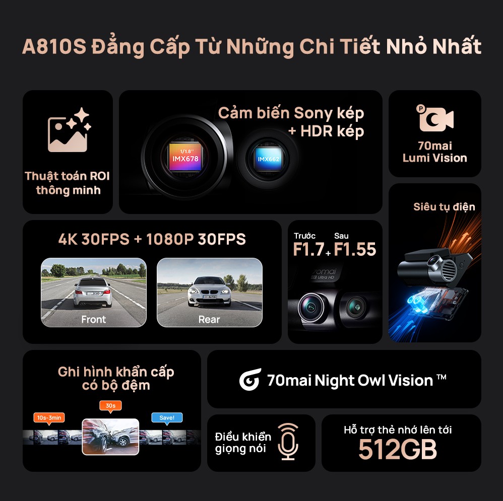 Camera hành trình 70mai A810S là dòng sản phẩm cao cấp của nhà 70mai. Được trang bị hệ thống cảm biến hình ảnh Sony STARVIS 2 và công nghệ HDR cho cả camera trước và sau (IMX678 & IMX662) cùng siêu tụ điện bền bỉ mang đến trải nghiệm hình ảnh 4K sắc nét và chân thực đến kinh ngạc. Từ khả năng điều khiển giọng nói rảnh tay đến hỗ trợ thẻ nhớ lên tới 512GB, A810S chính là người bạn đồng hành không thể thiếu cho mọi chủ xe tinh tế.