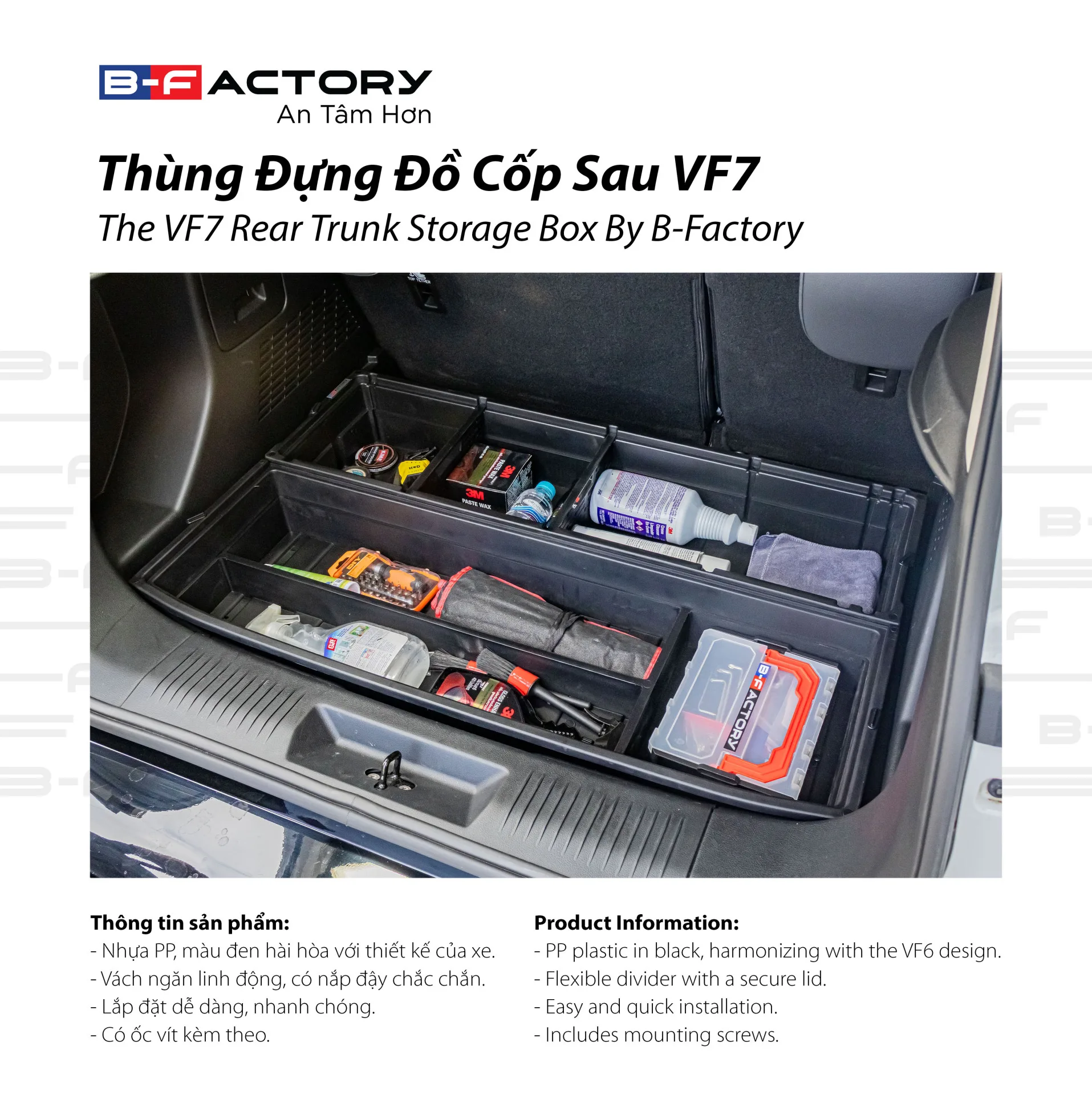Thiết kế tiện lợi: kích thước chuẩn theo khoang cốp VF 7, không cấn vào bánh sơ cua. Sản phẩm có vách ngăn linh động có thể tháo rời, nắp đậy thùng bằng gỗ bọc nỉ thẩm mỹ.